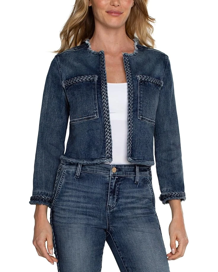- Elevate your style with the Liverpool™ Los Angeles Denim Jacket − a fusion of versatility and fashion in beautiful stretch denim. Embrace a unique look with braided detailing and a chic fray hem. Two patch pockets offer convenience, while the long sleeves and pull-on closure ensure comfort.