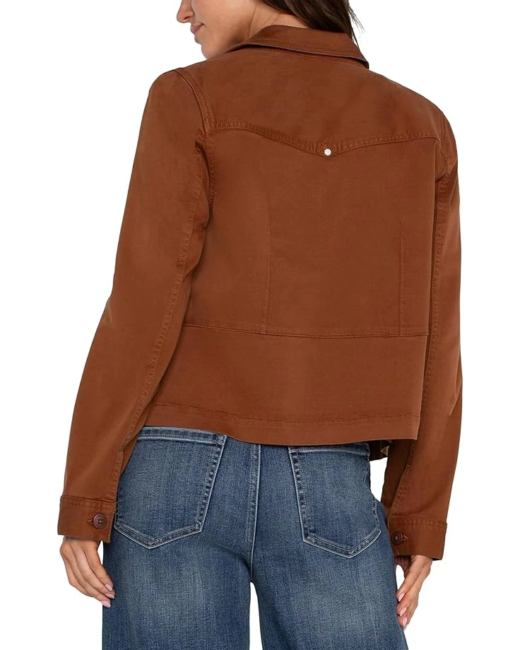 - Update your wardrobe with the fabulous Liverpoolâ„¢ Los Angeles Peplum Hem Trucker Jacket Cropped Shirt Jacket Soft Touch Twill. This beautifully hued jacket is made with premium soft stretch twill fabric and cotton blend lining that offer long-lasting comfort and better movement. The long sleeves, collared neckline, straight hem, and buttoned front closure add to its style and functionality. This button-down jacket offers a Touch of flirtiness mixed with edge, giving you styling versatility.