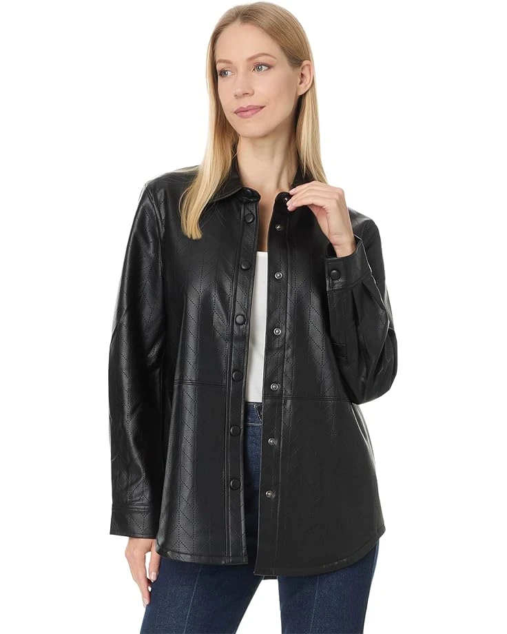 - Embrace sophisticated style donning the Liverpoolâ„¢ Los Angeles Seamed Shacket! Introducing our Seamed Shacket, a fusion of sophistication and trend-setting style tailored for the modern woman who exudes confidence and flair. This versatile piece combines the structure of a shirt with the warmth of a jacket, offering a seamless transition between seasons. What sets this shacket apart is its luxurious chevron perforated vegan leather fabric, adding a touch of opulence to your ensemble while staying true to ethical fashion. Features include long sleeves, a button front closure, and a collared neck, ensuring you stay chic and comfortable all day long.