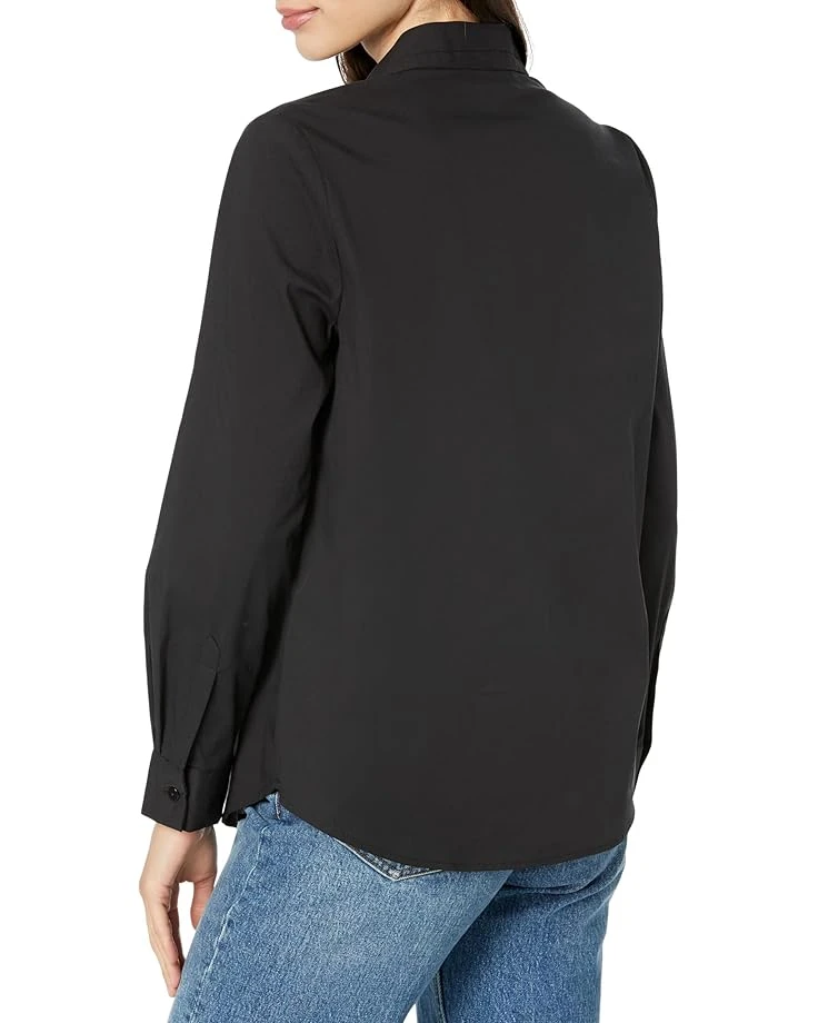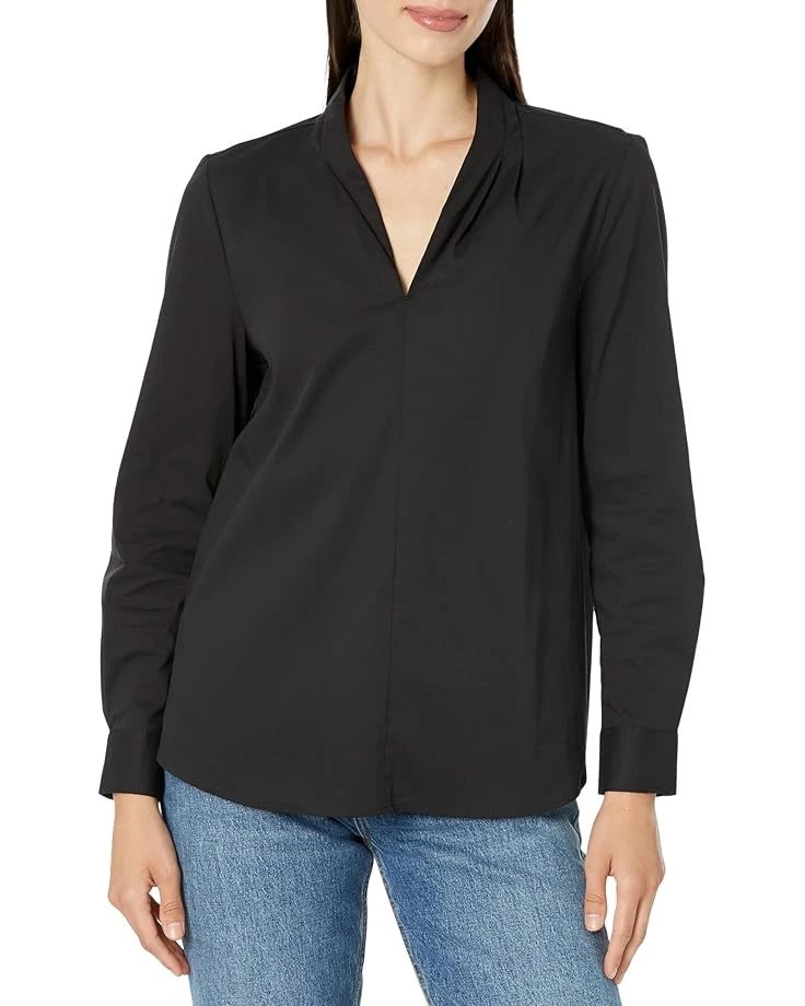 - Add a sophisticated hint to your casual and formal ensembles wearing the Liverpool™ V-Neck Long Sleeve Woven Top with Pleat Details. It features a band collar and long sleeves with buttoned cuffs.